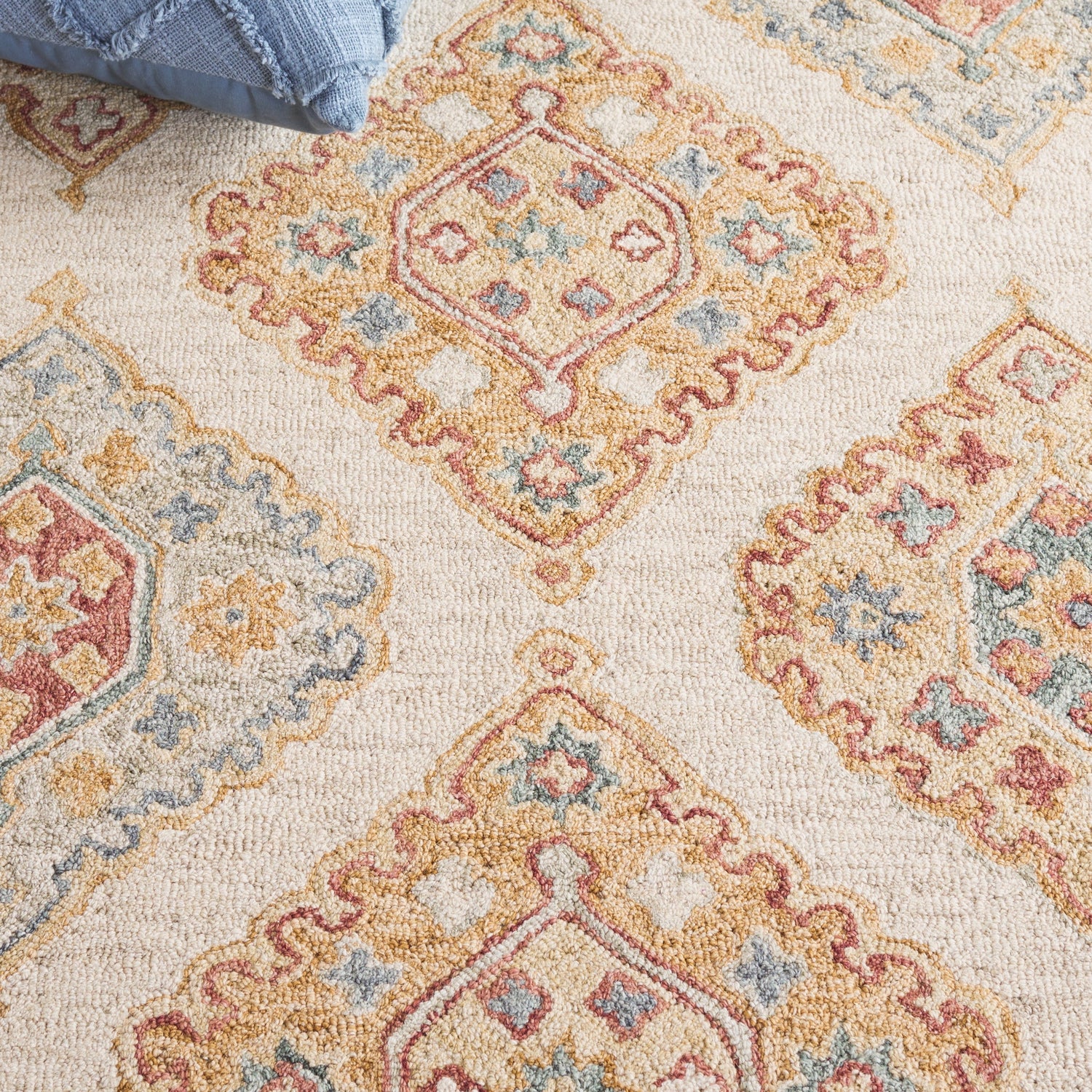 This hand-tufted masterpiece boasts a rich composition of 80% Wool and 20% Cotton, ensuring a luxurious feel underfoot with the durability to match. Crafted with care in India, our rug features a graceful beige and rust color palette that exudes warmth and elegance, perfectly accentuated by a pattern that showcases ornate medallions and intricate border detailing. The design draws inspiration from historical motifs, bringing a touch of timeless beauty to any space it graces. With a comfortable height of 1/2'', this rug is not only a visual treat but also a delight to walk on, offering a balance of softness and a substantial floor covering experience. Whether placed in a hallway, kitchen, or entryway, this rug will enrich your home with its serene hues and alluring pattern. Embrace the charm of our Transitional style rug and give your home a touch of refined beauty with its harmonious design.